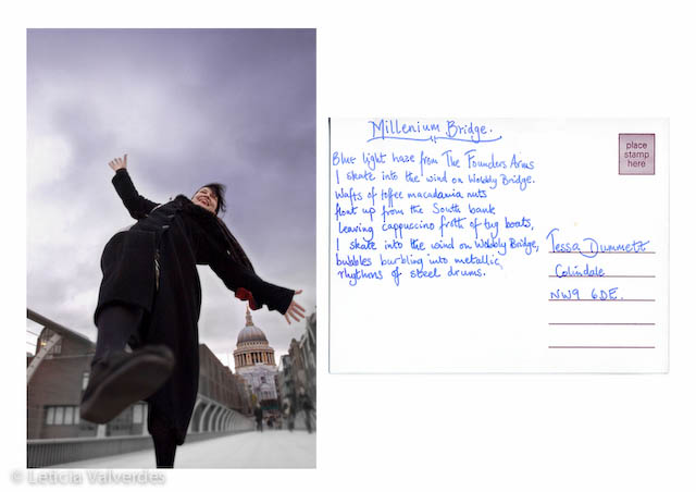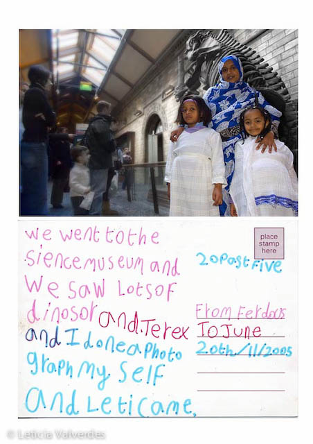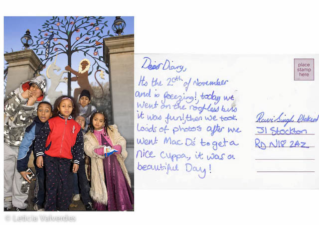 We made postcards, they wrote them, sent to family and friends around the world or kept them for themselves. Later the participants distributed copies of the postcards throughout the city of London.